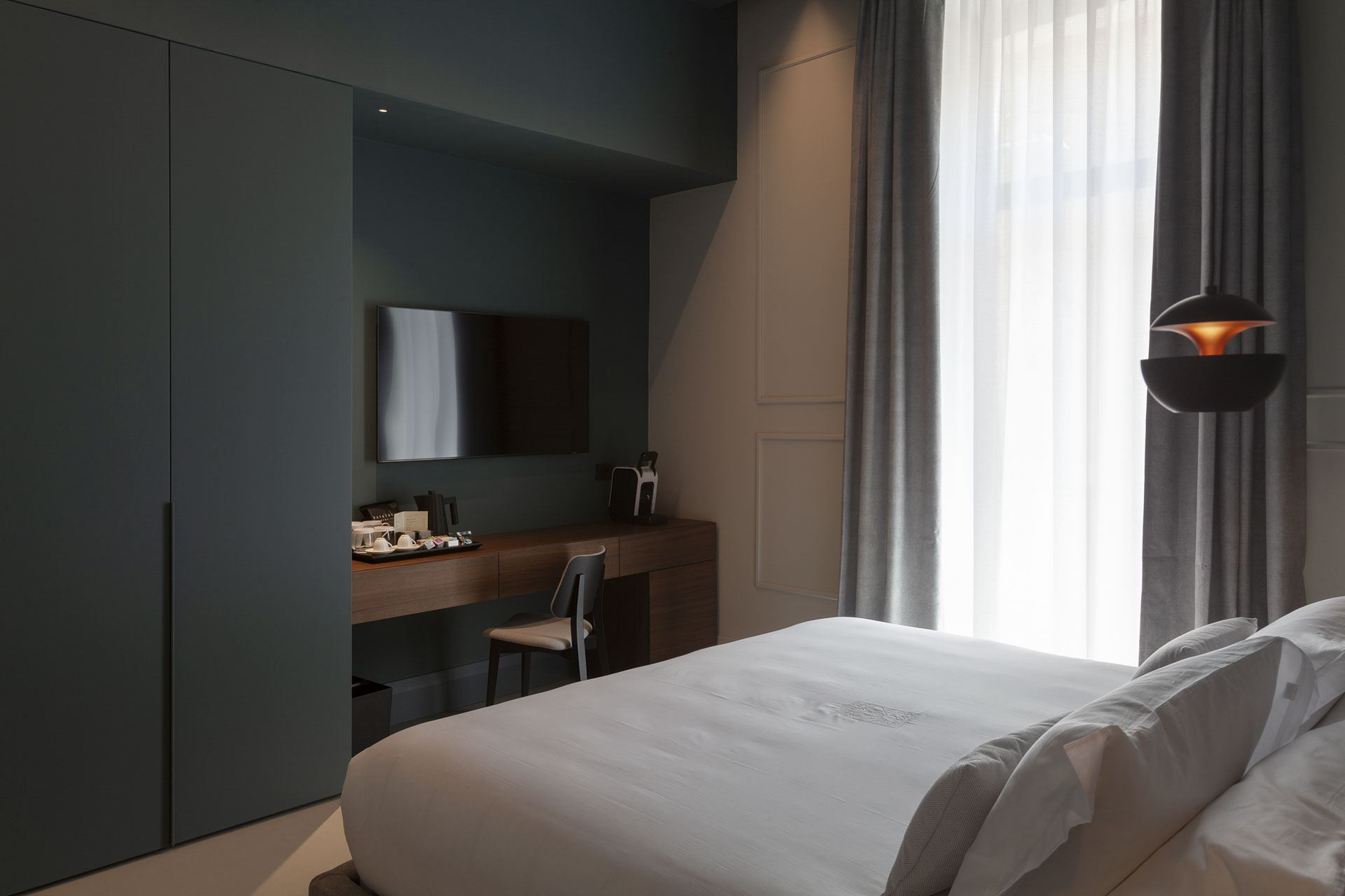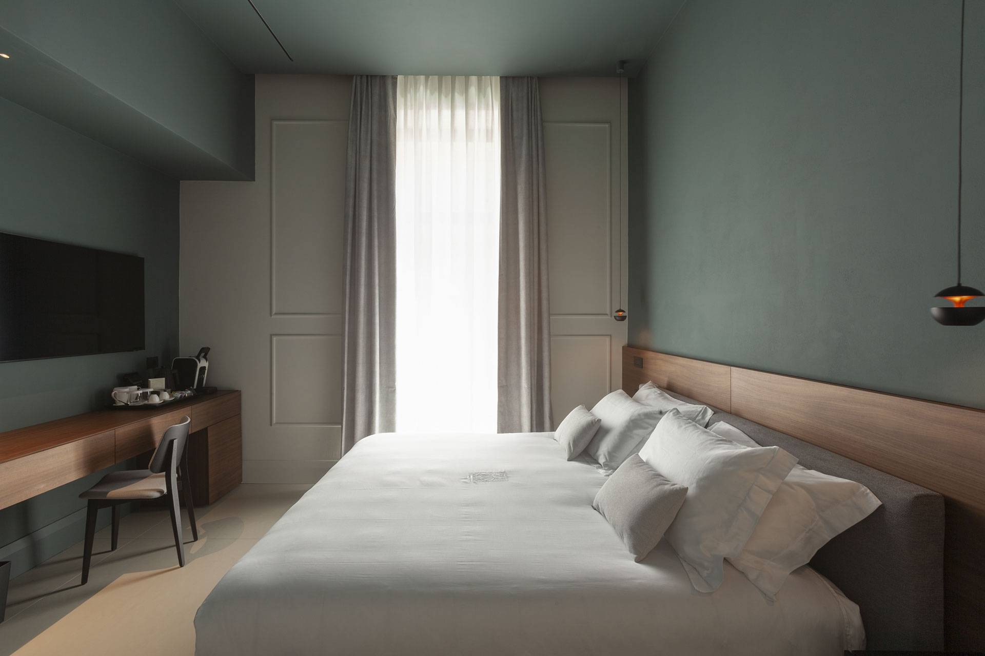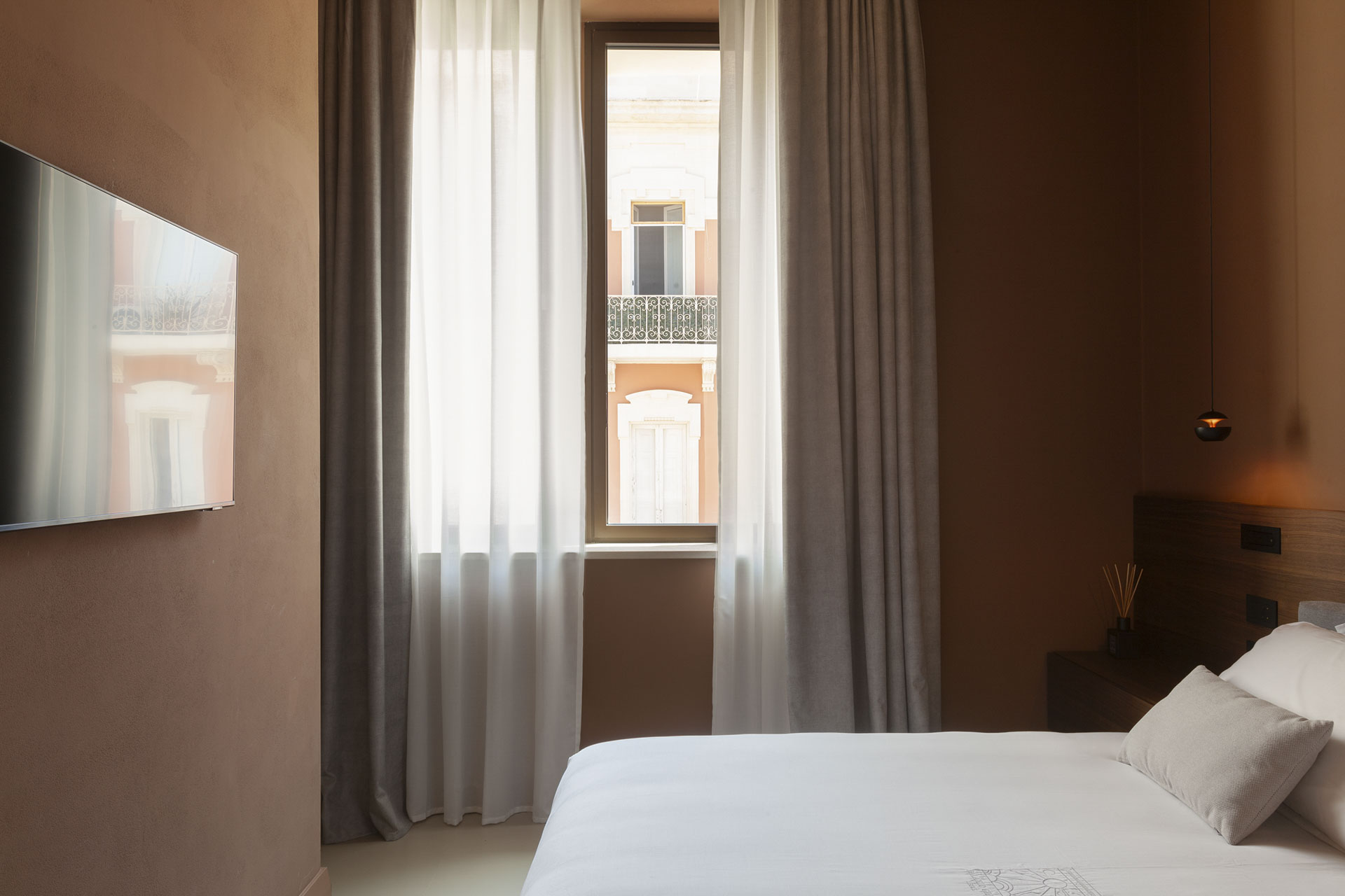 Le camere di Palazzo Giusti Lecce hanno un carattere unico grazie al design leggero e ai colori decisi che le definiscono. I pavimenti in ceramica, i rivestimenti in legno e il legno che compongono ogni suite e che definiscono il concept del nuovo edificio offrono un ambiente moderno, accogliente e rilassante e sono superbamente combinati con arredi dal carattere unico, definendo il concept con estro ed eleganza.