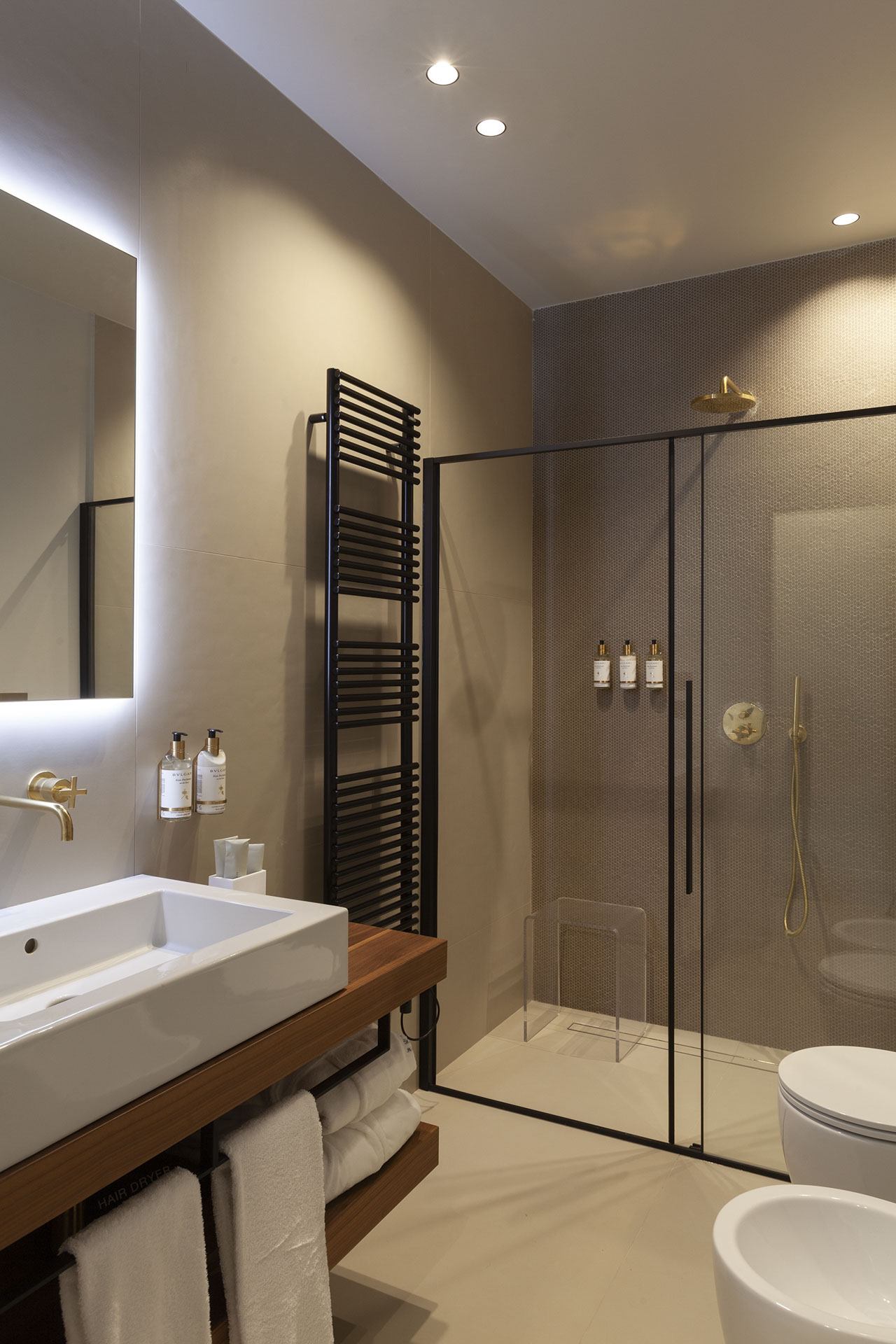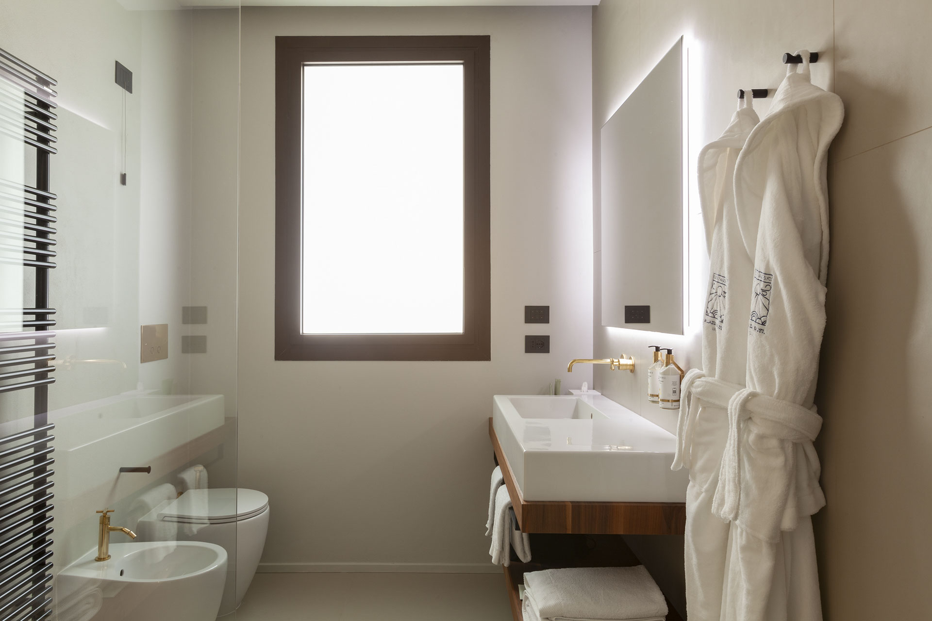 La Suite Executive ha un ingresso dal cortile interno, un soggiorno con un grande tavolo, una camera con letto king size e un bagno in ceramica bianca con doccia.